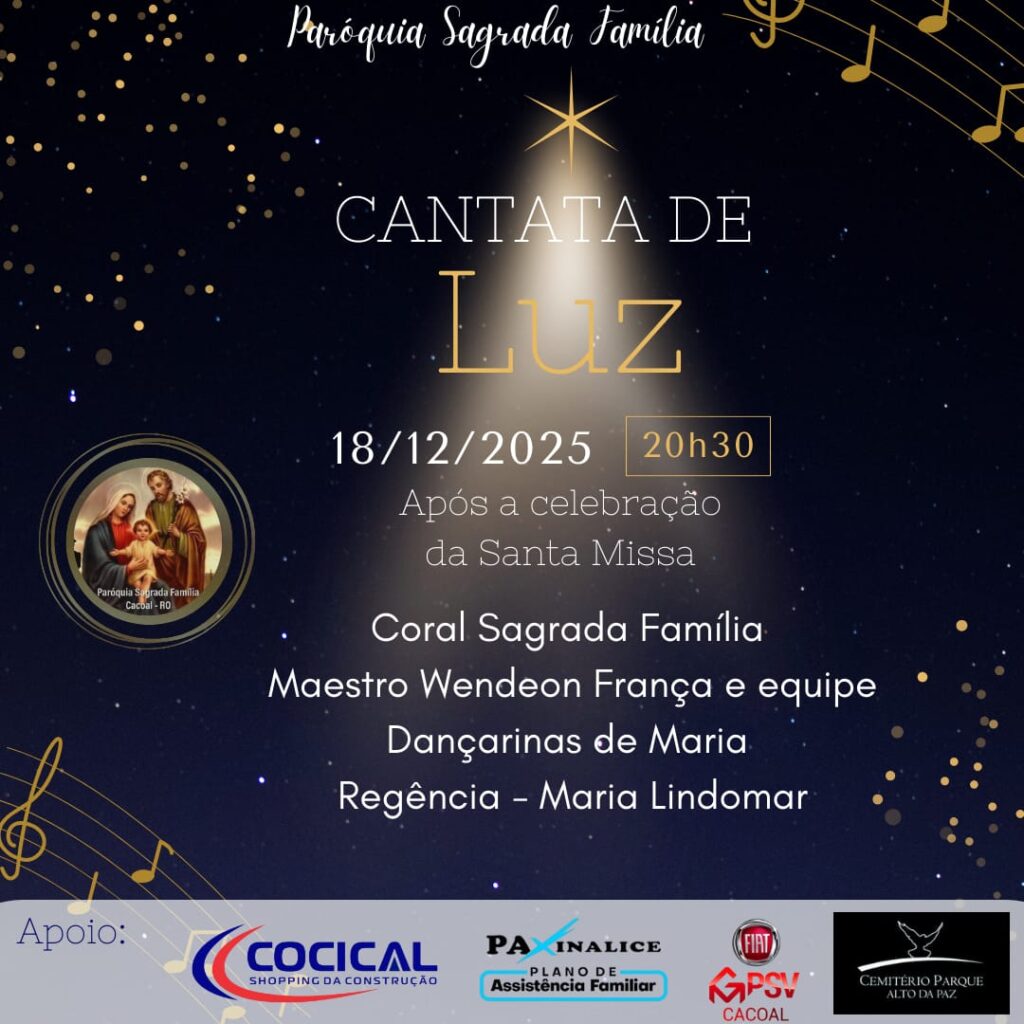 A Paróquia Sagrada Família, em Cacoal (RO), promoverá no dia 18 de dezembro de 2025, às 20h30, a Cantata de Luz, evento especial que será realizado após a celebração da Santa Missa. A apresentação reunirá música, fé e emoção em uma noite preparada para celebrar o espírito natalino.