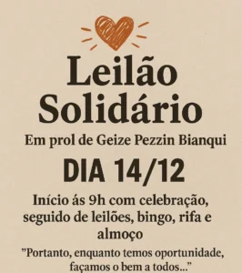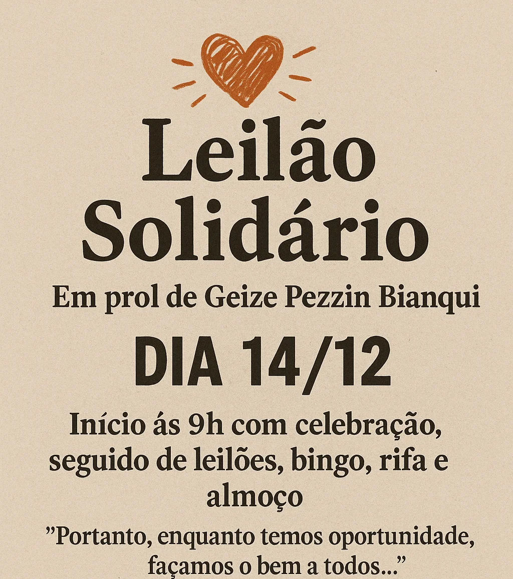 A comunidade de Aparecida e região se prepara para um grande gesto de solidariedade no próximo 14 de dezembro, com a realização de um Leilão Solidário em prol de Geize Pezzin Bianqui. O evento será na Comunidade Nossa Senhora Aparecida, situada na Linha 12, KM 01, ponto de referência conhecido pelos moradores e tradicional palco de encontros comunitários.