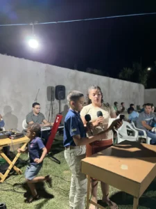 A alegria se espalhou rapidamente. Os policiais cantaram “Parabéns”, jantaram com a família, tiraram fotos com os convidados e presentearam Juninho com lembranças simbólicas da corporação, como uma garrafinha e um broche, que ele guardou com muito carinho.