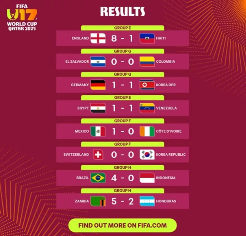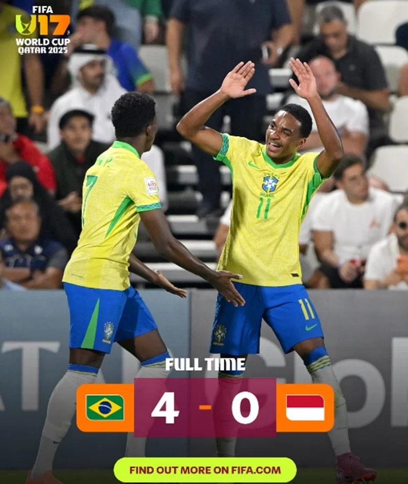 A seleção brasileira masculina cravou a segunda goleada seguida no Mundial Sub-17 em Doha (Catar) e avançou para a próxima fase (eliminatória). Nesta sexta-feira (7), a Amarelinha fez 4 a 0 contra a Indonésia no segundo jogo da fase de grupos, no complexo esportivo Aspire Zone. Luís Eduardo abriu o placar logo aos 2 minutos, e ainda no primeiro tempo teve gol contra (Panji) e o terceiro foi de Felipe Morais. Na etapa final, Ruan Pablo selou a vitória com um belo chute da intermediária.Com o triunfo de hoje, o Brasil totalizou seis pontos e lidera o grupo H ao lado de Zâmbia – adversário no último duelo da fase de grupos. Ambas as equipes já estão asseguradas no mata-mata (fase eliminatória), pois somam duas vitórias. O Brasil tem maior saldo de gols (7 contra Honduras + 4 contra Indonésia). Já a Zâmbia ganhou por 3 a 1 da Indonésia, e por 5 a 2 contra Honduras.