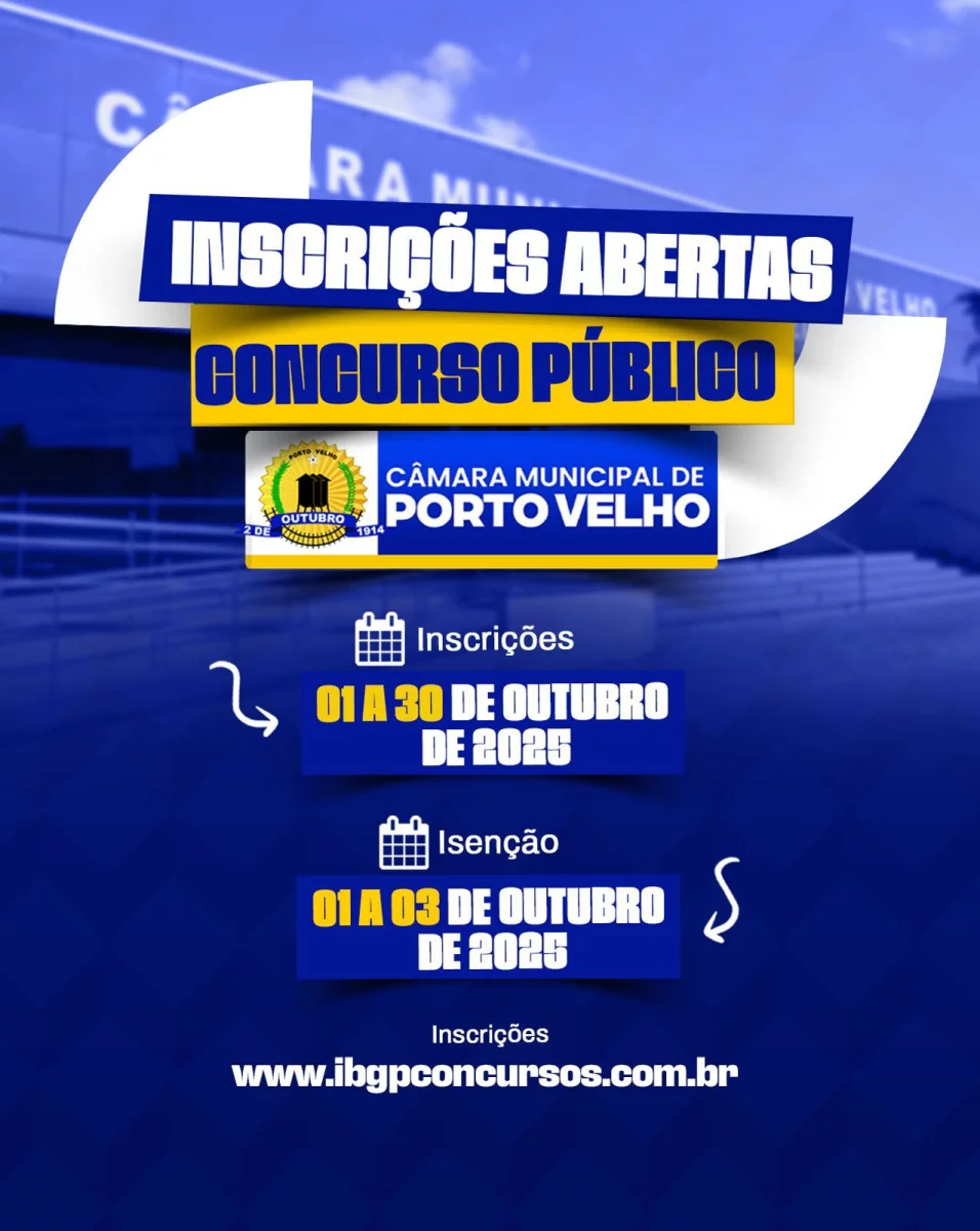 A Câmara Municipal de Porto Velho informa à população que estão abertas as inscrições para o Concurso Público destinado ao provimento de cargos efetivos do quadro de pessoal da Casa Legislativa. O certame será realizado em parceria com o Instituto Brasileiro de Gestão e Pesquisa (IBGP) e contempla oportunidades em diferentes níveis de escolaridade.