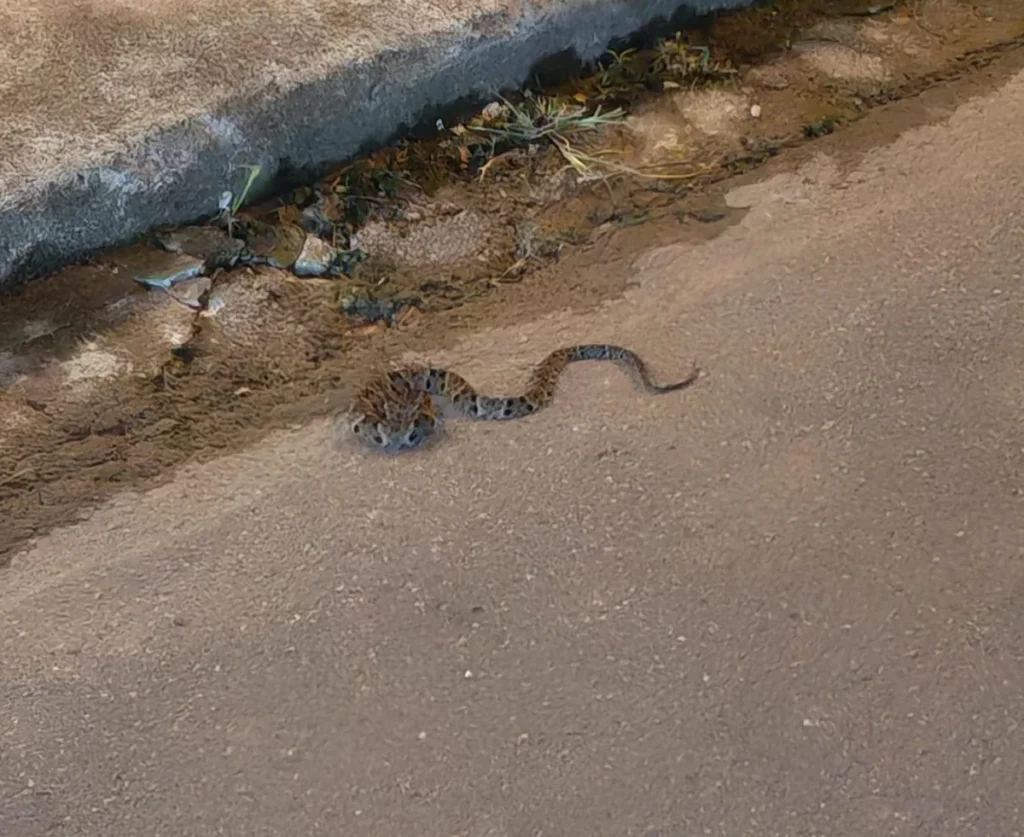 A presença da cobra chamou a atenção de quem passava pelo local e acendeu o alerta sobre os riscos, já que a jararaca é uma espécie peçonhenta.