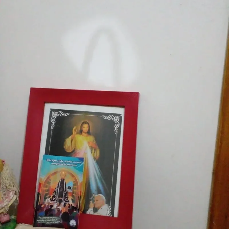 A fotografia registra o fenômeno: um arco suave acima da imagem religiosa, discreto, quase respeitoso.