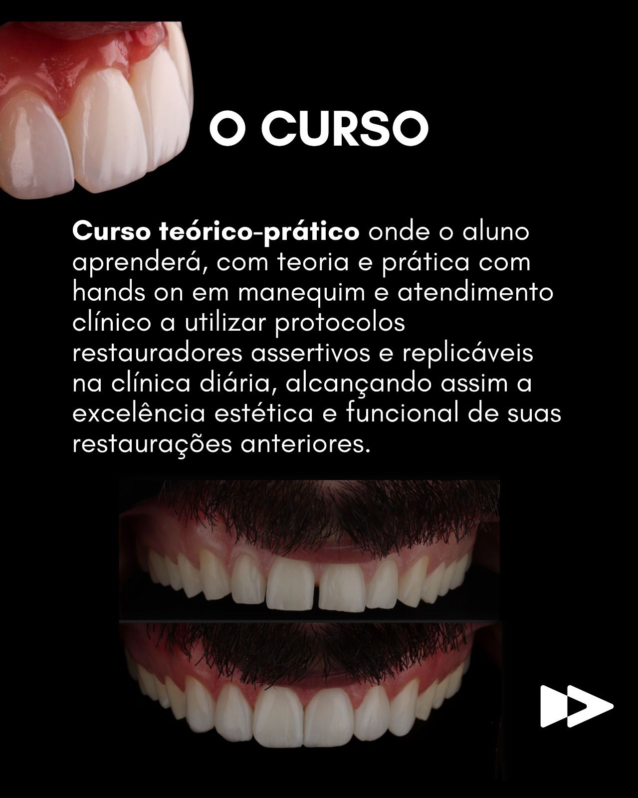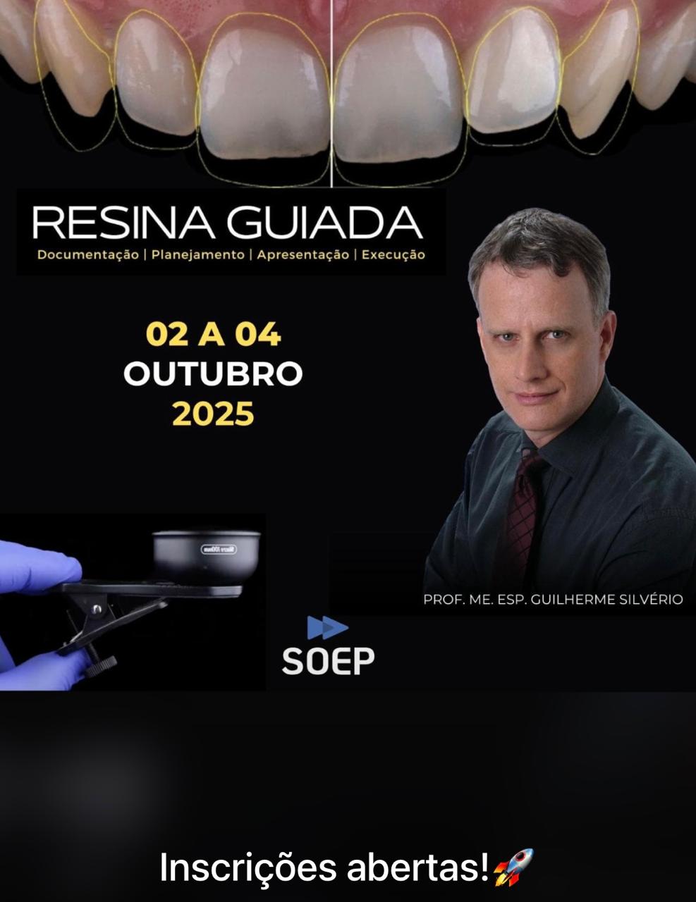 Curso de Resina Guiada tem o foco em restaurações estéticas direcionadas por guia de resina, promovendo maior precisão, previsibilidade e estética nos resultados e envolvendo temas como documentação de casos, planejamento digital, apresentação dos casos, e execução das restaurações. O profissional aprende a realizar análises estéticas (como proporções faciais e preferências do paciente) e a criar um modelo virtual do sorriso, com simulações em tempo real antes do tratamento clínico.