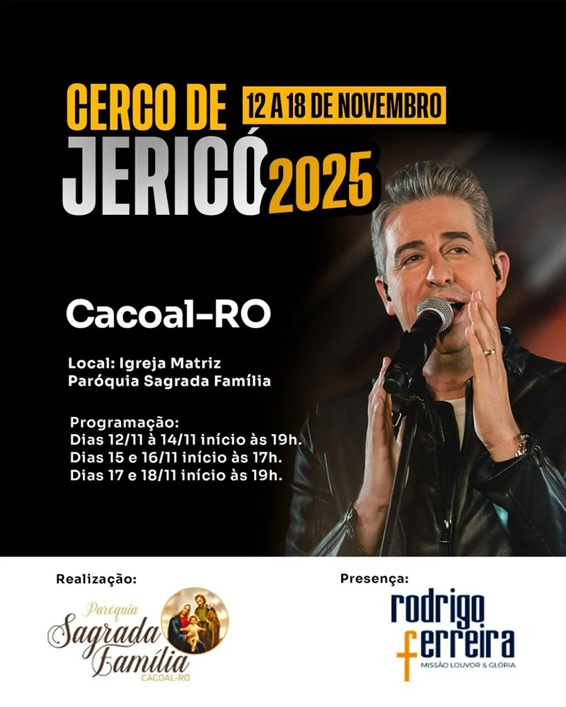 A Paróquia Sagrada Família, em Cacoal (RO), realizará entre os dias 12 e 18 de novembro o Cerco de Jericó 2025, uma das mais tradicionais programações de oração e louvor da comunidade católica local. O evento acontecerá na Igreja Matriz, reunindo fiéis para momentos de espiritualidade, música e reflexão.