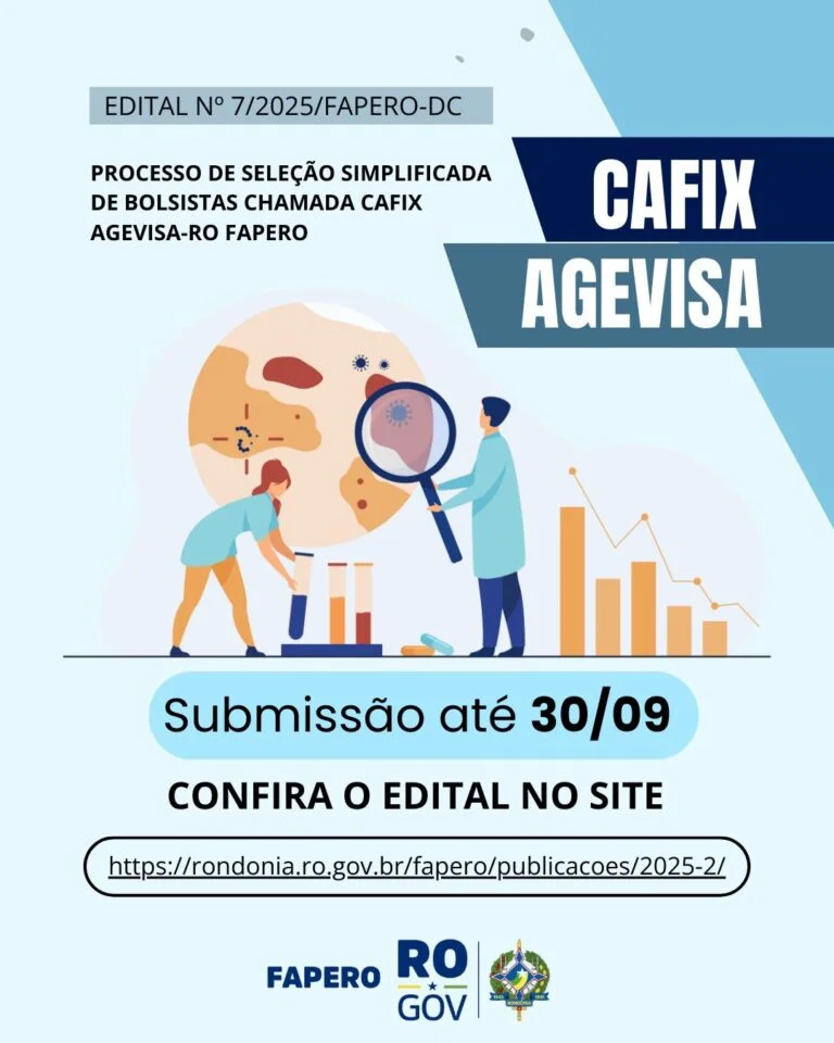 O governo de Rondônia, por meio da Fundação de Amparo ao Desenvolvimento das Ações Científicas e Tecnológicas e à Pesquisa (Fapero), torna pública a chamada do Processo de Seleção Simplificada de Bolsistas – Chamada CAFIX AGEVISA-RO FAPERO nº 07/2025. O edital está disponível, que segue com inscrições abertas até 30 de novembro. As bolsas, concedidas por meio de processo público seletivo simplificado, são destinadas a proponentes que desempenhem atividades de caráter técnico-científico nas áreas relacionadas ao desenvolvimento da Vigilância em Saúde em Rondônia, abrangendo ensino, pesquisa e extensão correlatas.