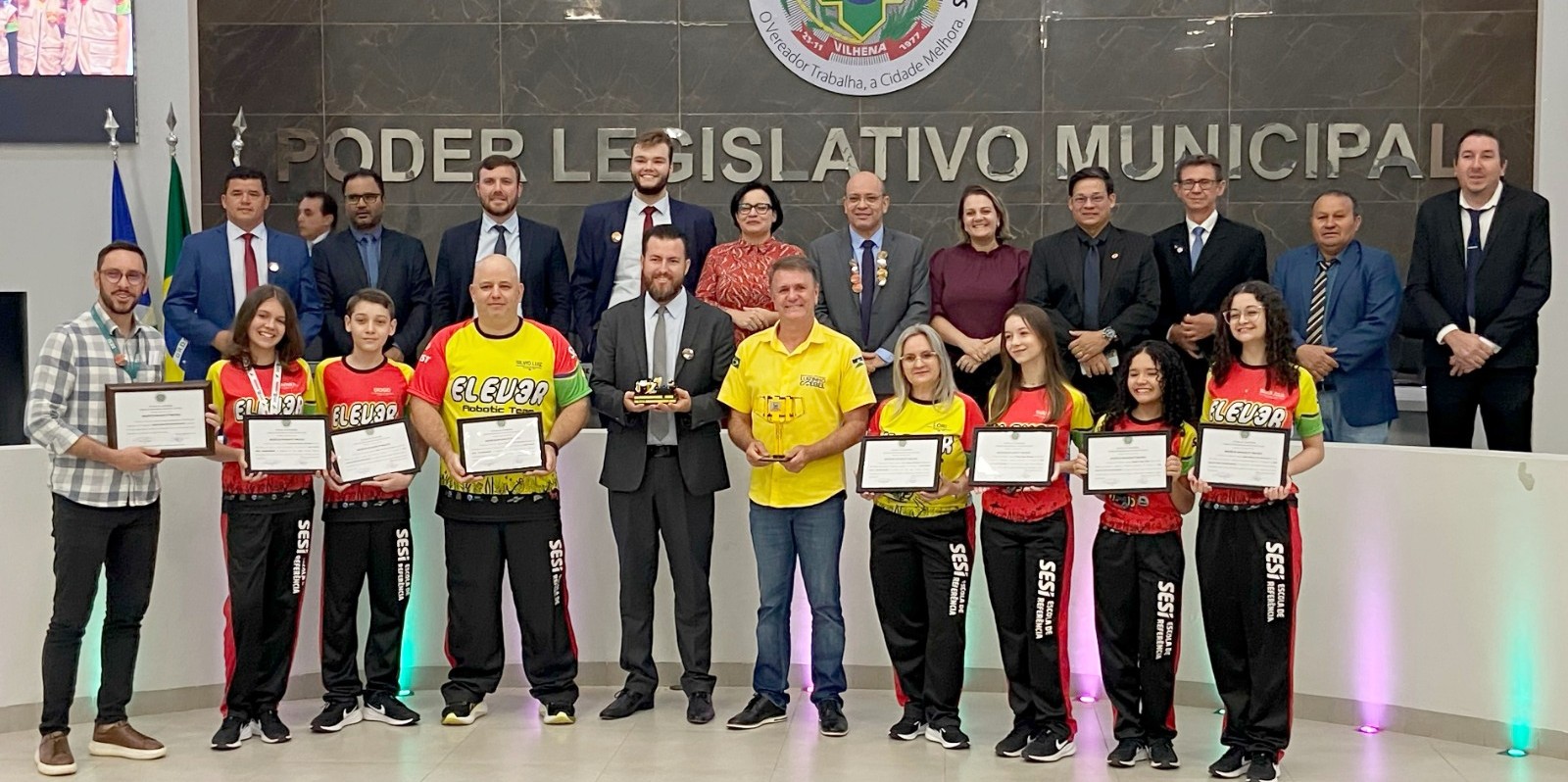 A equipe campeã de robótica do Sesi de Vilhena recebeu uma homenagem especial na câmara municipal, destacando suas conquistas e contribuição para o desenvolvimento tecnológico da região. A homenagem foi realizada na Câmara de Vereadores de Vilhena com a presença do deputado Luizinho Goebel (Podemos), que reconheceu o talento e se mostrou entusiasmado com as inovações tecnológicas e do potencial dos jovens estudantes.