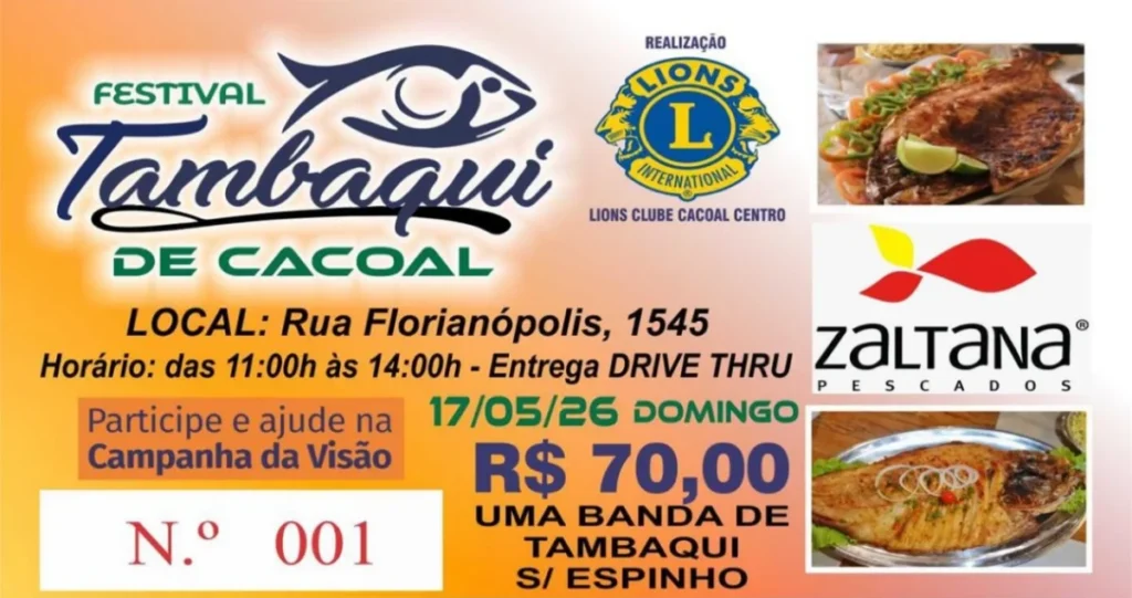 O Lions Club Cacoal Centro promove no dia 17 de maio de 2026 (domingo) mais uma edição do tradicional Festival do Tambaqui em Cacoal. A ação será realizada na Rua Florianópolis, nº 1545, com atendimento ao público das 11h às 14h, para retirada no sistema drive-thru.