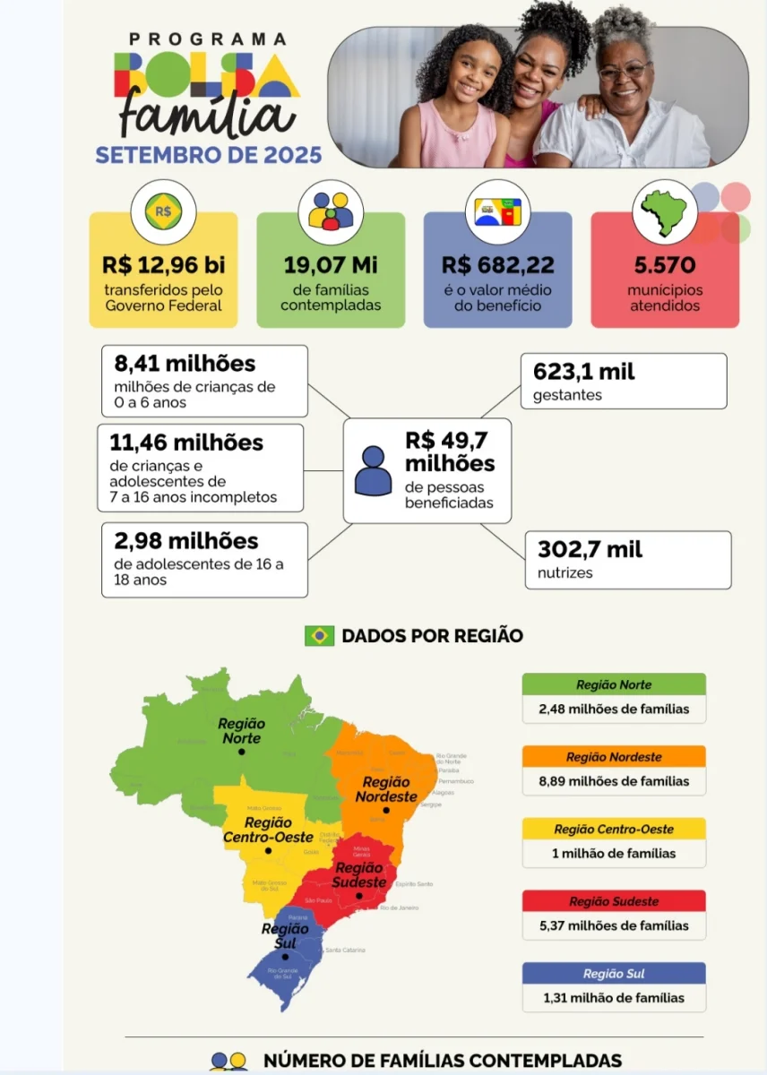 NACIONAL – Em setembro, o Bolsa Família chega a 19,07 milhões de famílias em todos os 5.570 municípios do país, com impacto direto em 49,75 milhões de pessoas. O valor médio de repasse em setembro é de R$ 682,22, a partir de um investimento federal de R$ 12,96 bilhões.