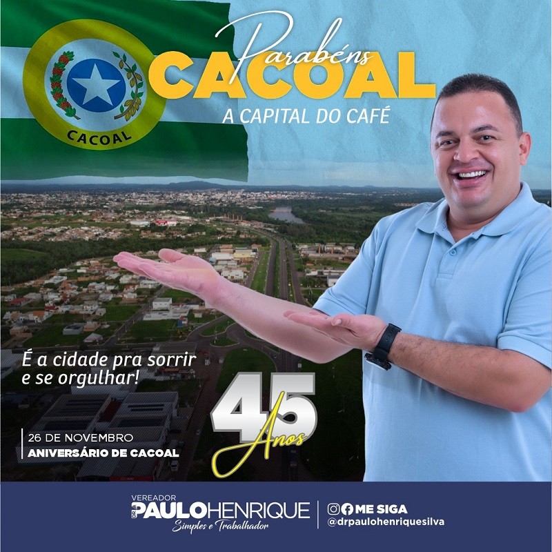 É impossível não se encantar com as belezas da cidade mais linda de Rondônia. Neste dia festivo, 26 de novembro de 2022, transmito à população minha felicitação por participar ativamente do progresso da “capital do café”. Parabéns Cacoal!