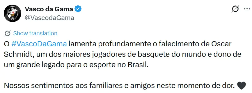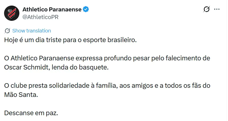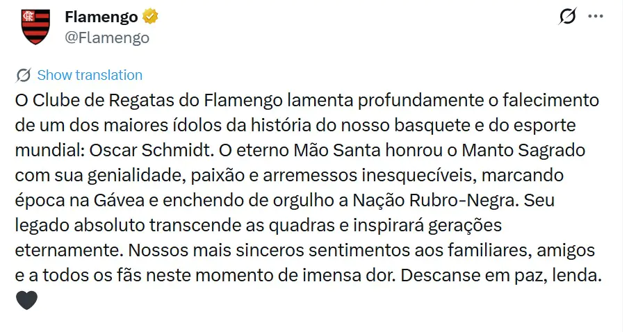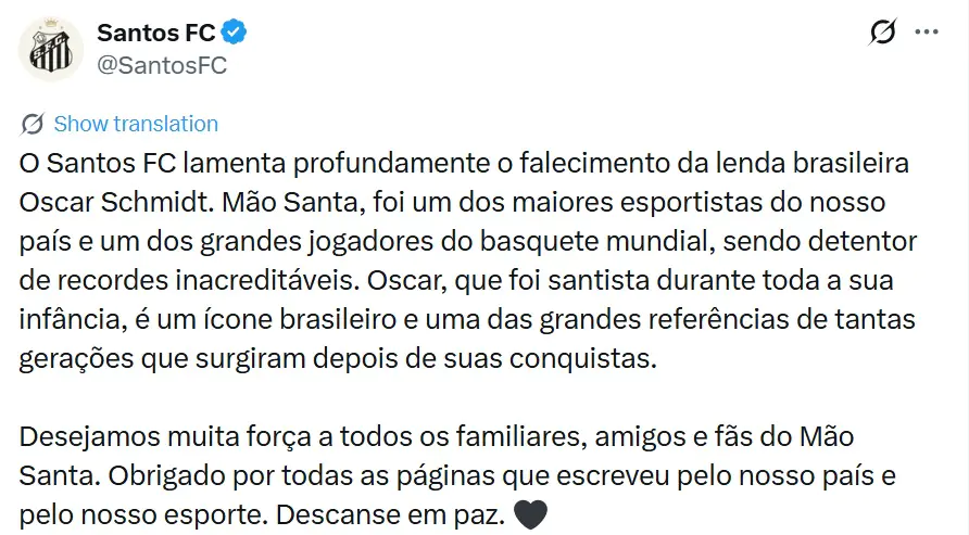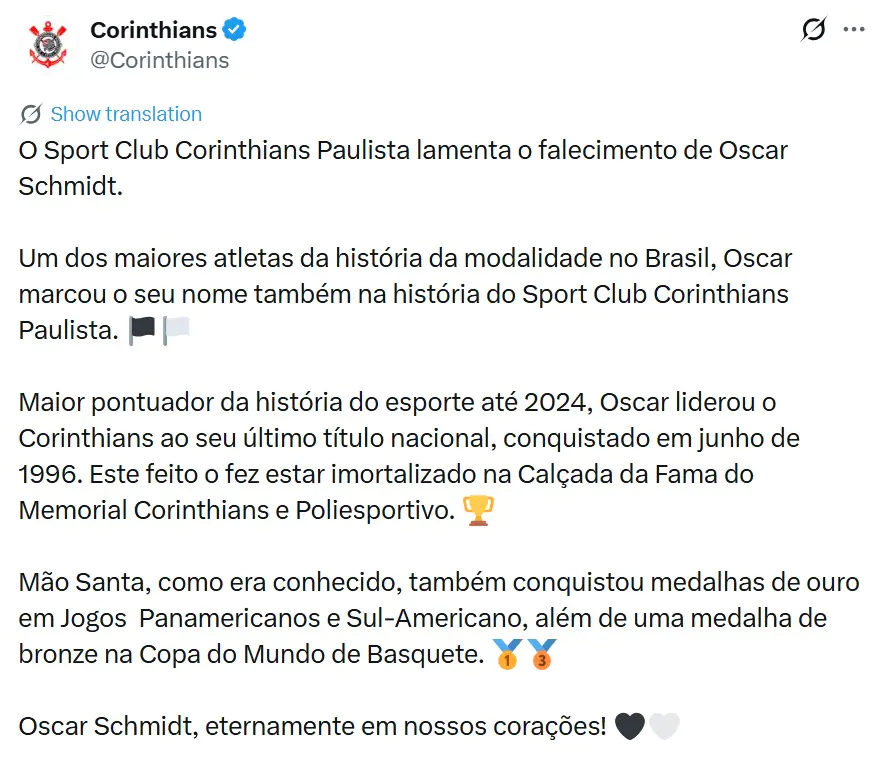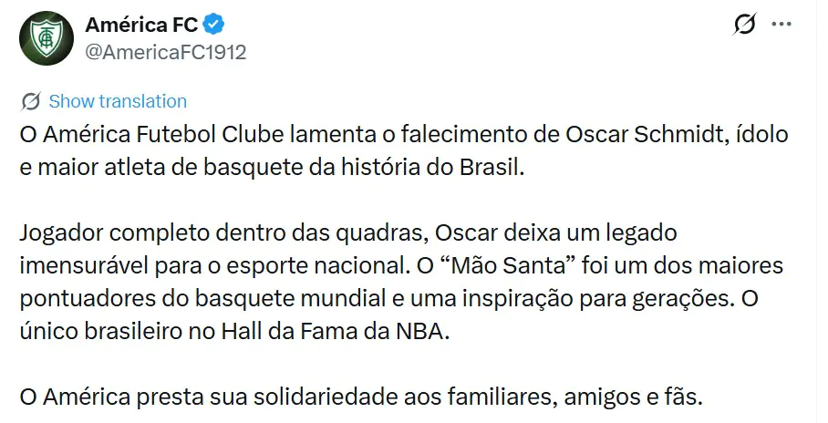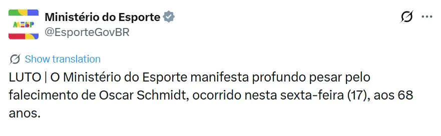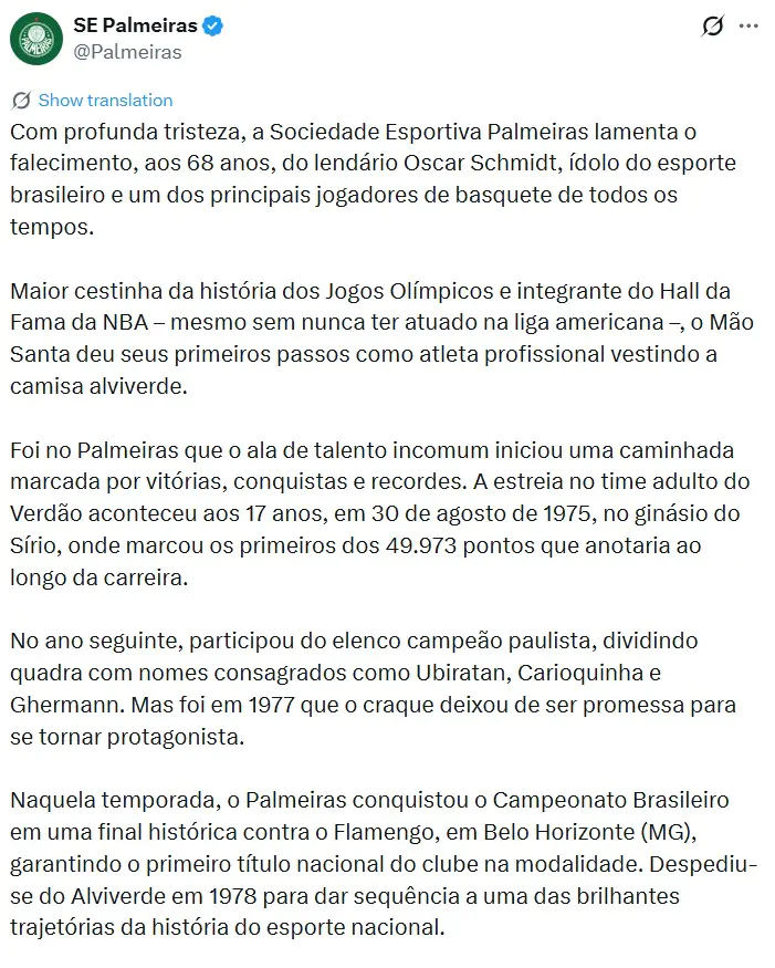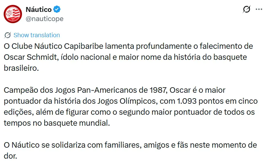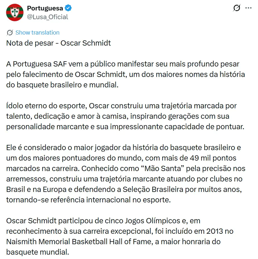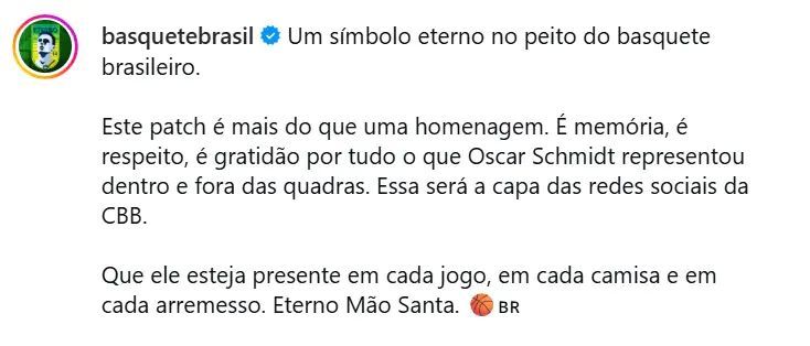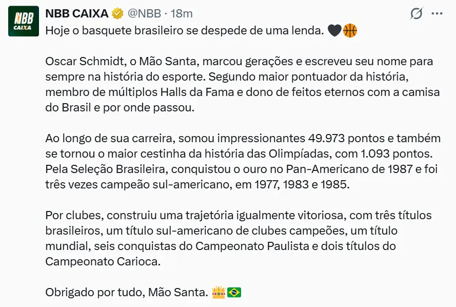 É com profundo pesar que comunicamos o falecimento de Oscar Schmidt, um dos maiores nomes da história do basquete mundial e uma figura de imenso significado humano e esportivo.