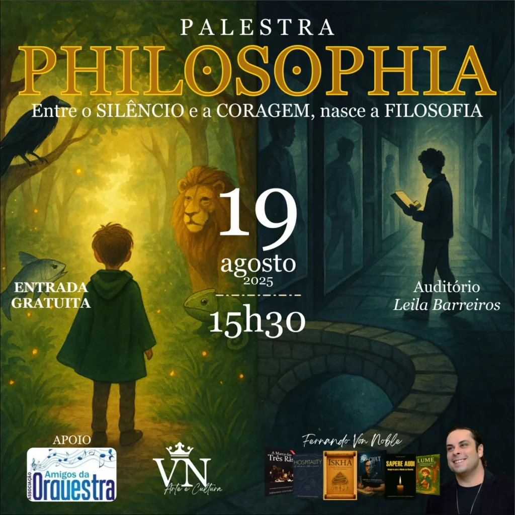 Como parte dos novos projetos do coordenador e maestro Wendeon França Rodovalho Silva, à frente dos Amigos da Orquestra, em parceria com a Von Noble Arte e Cultura, o escritor e filósofo amazônico Fernando Von Noble apresenta a palestra “Entre o silêncio e a coragem, nasce a filosofia”, voltada ao público infantojuvenil, como um convite poético e provocador à arte de pensar.