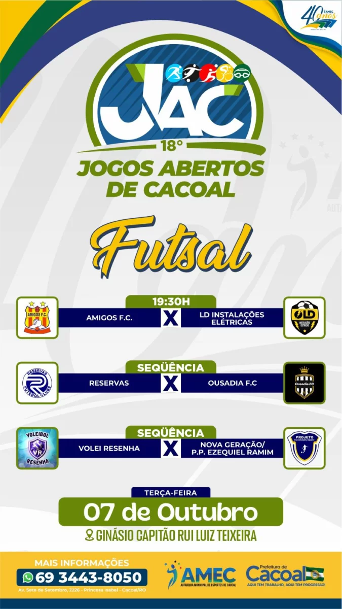 – O Ginásio Capitão Rui Luiz Teixeira será palco, nesta terça-feira (7), de intensas disputas de futsal dos 18º Jogos Abertos de Cacoal (JAC). A modalidade é uma das 18 que integram o evento esportivo, considerado o maior da cidade e promovido pela Prefeitura de Cacoal, por meio da Autarquia Municipal de Esportes de Cacoal (AMEC).