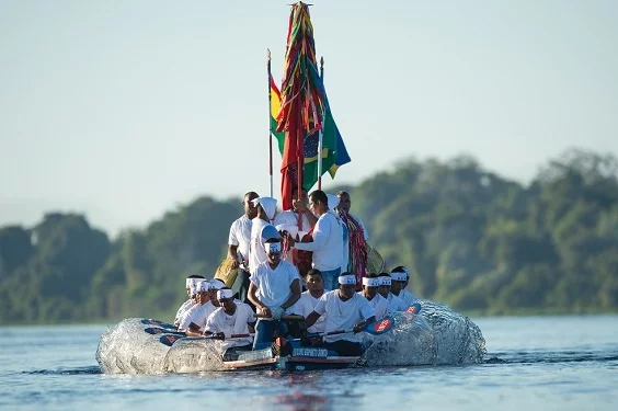 Aqui os símbolos maiores, a Coroa do Divino, o Cetro e a Bandeira são transportados numa romaria fluvial, de canoa mesmo, desde o Domingo de Páscoa até a quarta-feira anterior à Pentecostes, de vila em vila, são 49 paradas, no rio Guaporé até chegar à sede da Festa.